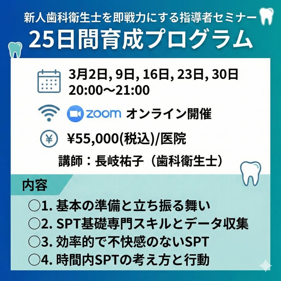 本セミナーでは、新人歯科衛生士を25日間で即戦力へ育成するための具体的な指導方法とポイントを体系的に学ぶことができます。